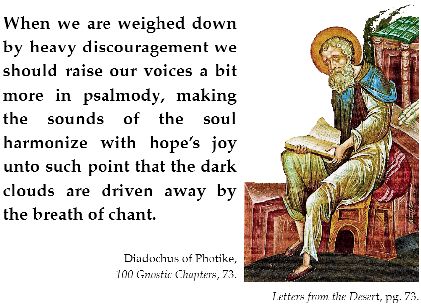 Note: Diadochus of Photike does not mean ‘Sing happy music to make the blues go away.’ He means that in melancholy/discouragement, turn to the Pslams, which contain lamentations that look forward in hope. By joining one’s personal distresses in with the distresses of the Pslams, the hope of the Psalms will become one’s own personal joys. — PPP